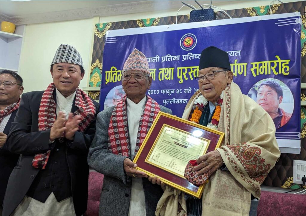 प्रतिष्ठानद्वारा काठमाण्डौमा आयोजित ‘प्रतिभा सम्मान तथा पुरस्कार समर्पण समारोह’ मा नेपाल प्रज्ञा–प्रतिष्ठानका पूर्वकुलपति मुन्धुम विद बैरागी काईलाज्यूले ताम्रपत्र र ५० हजार नगदराशिको सम्मान थैली सम्मानीत स्रष्टालाई र ताम्र पत्र सहित रू १,००००० एक लाख नगदराशिको पुरस्कार थैली पुरस्कृत स्रष्टालाई प्रदान गर्नुभयो ।