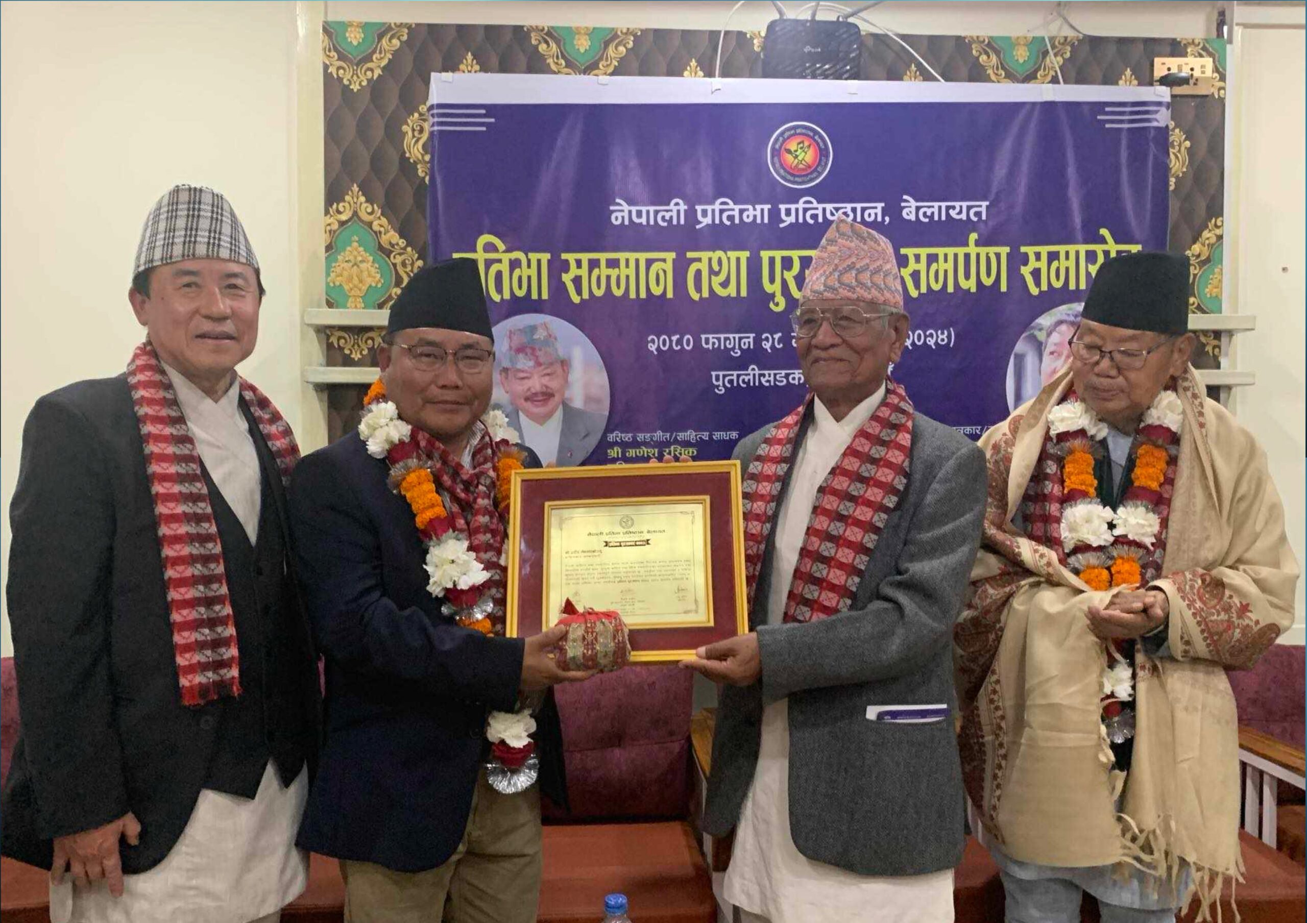 काठमाण्डौ, नेपाली प्रतिभा प्रतिष्ठान, बेलायतले यस वर्षका लागि प्रसिद्ध साहित्य तथा सङ्गीत साधक गणेश रसिकलाई प्रतिभा सम्मान २०२३ र प्रतिभा पुरस्कार २०२३ मुन्धुमी कवि, कथाकार तथा पत्रकार प्रदीप मेन्याङ्बोलाई काठमान्डौको ग्रिनलिफ फुड क्याफेमा बिशिष्ट ब्यत्तित्वहरू साथै संन्चार कर्मीहरू बीच एक भब्य कार्यक्रम गरी सम्मान र पुरस्कार हस्तान्त्रण गरिएको छ।